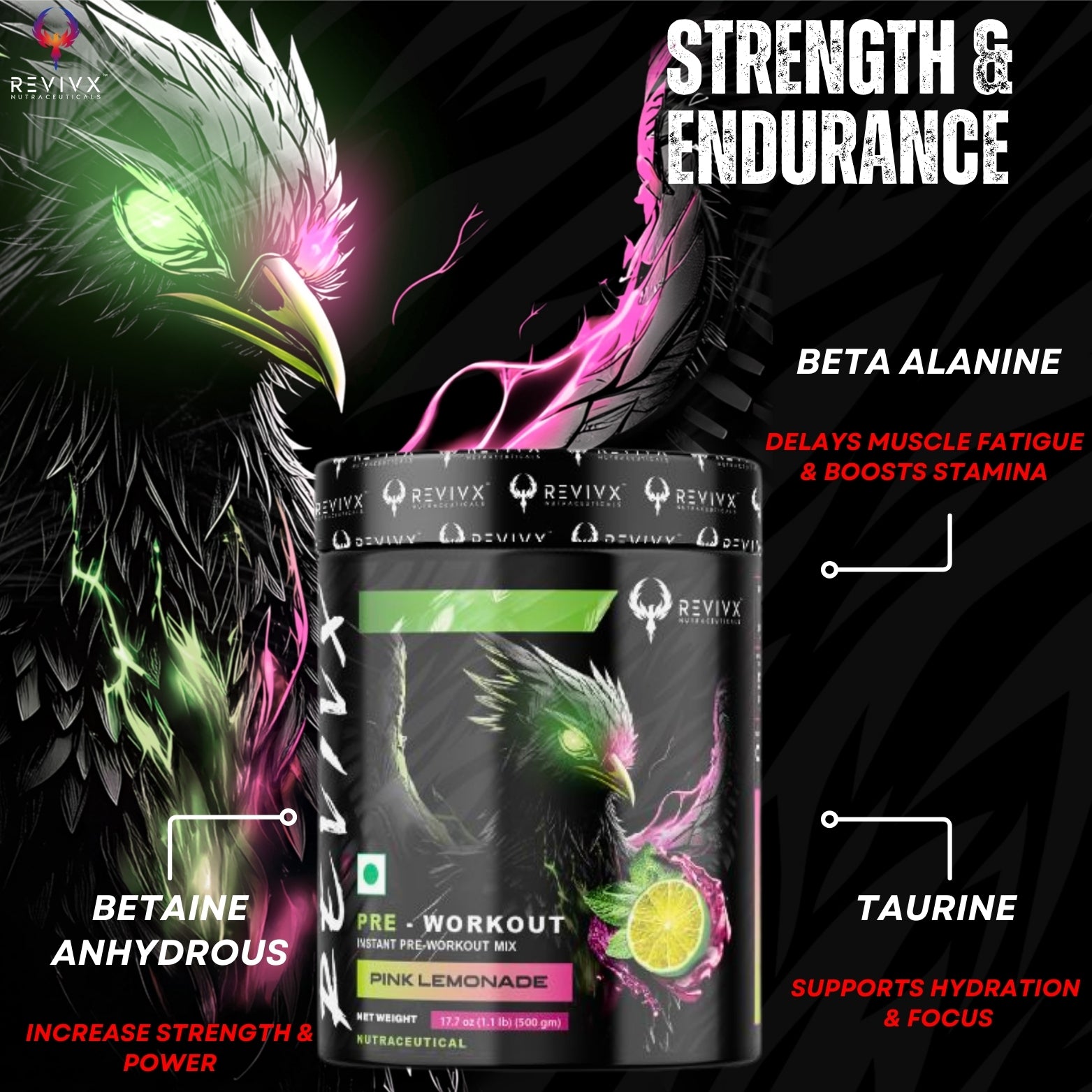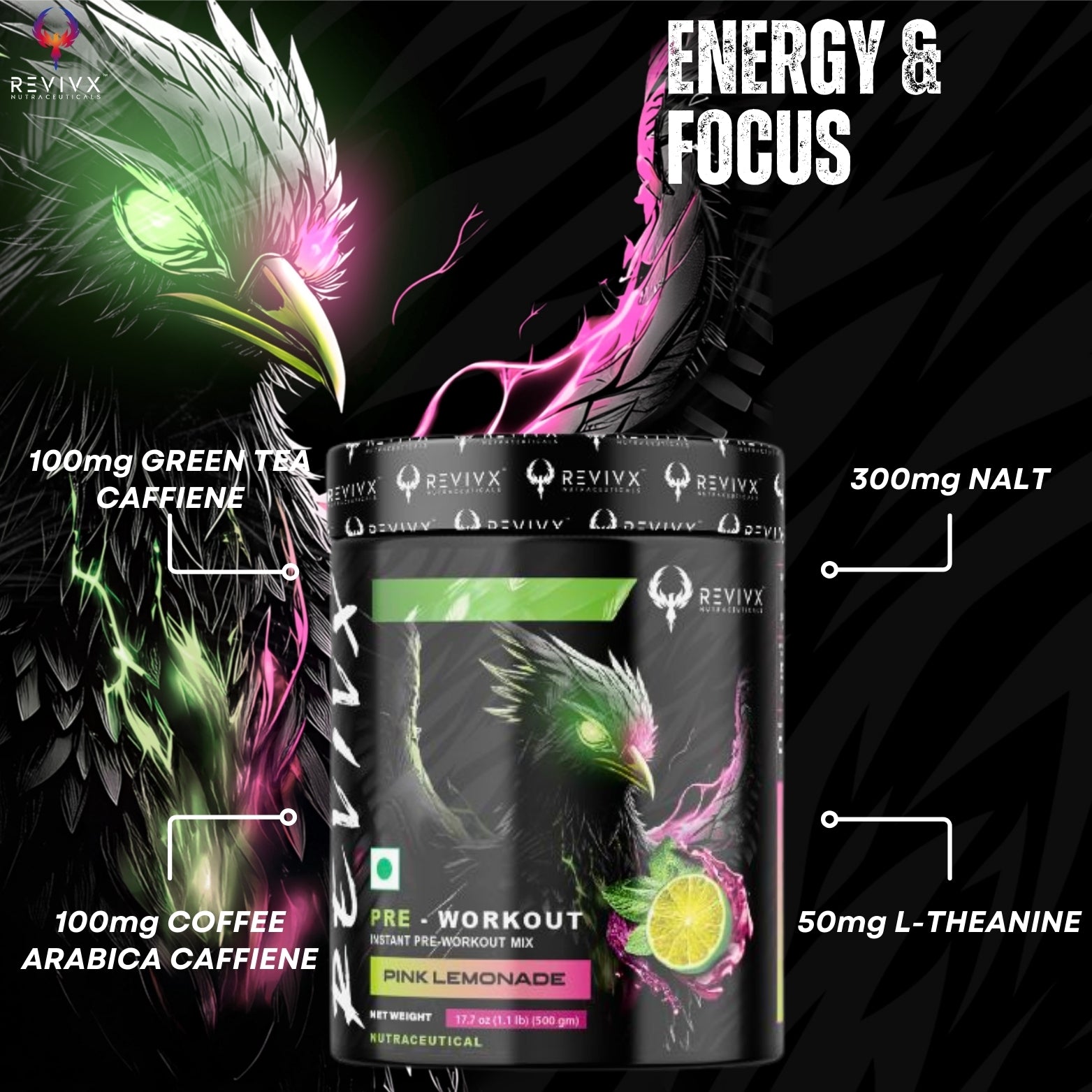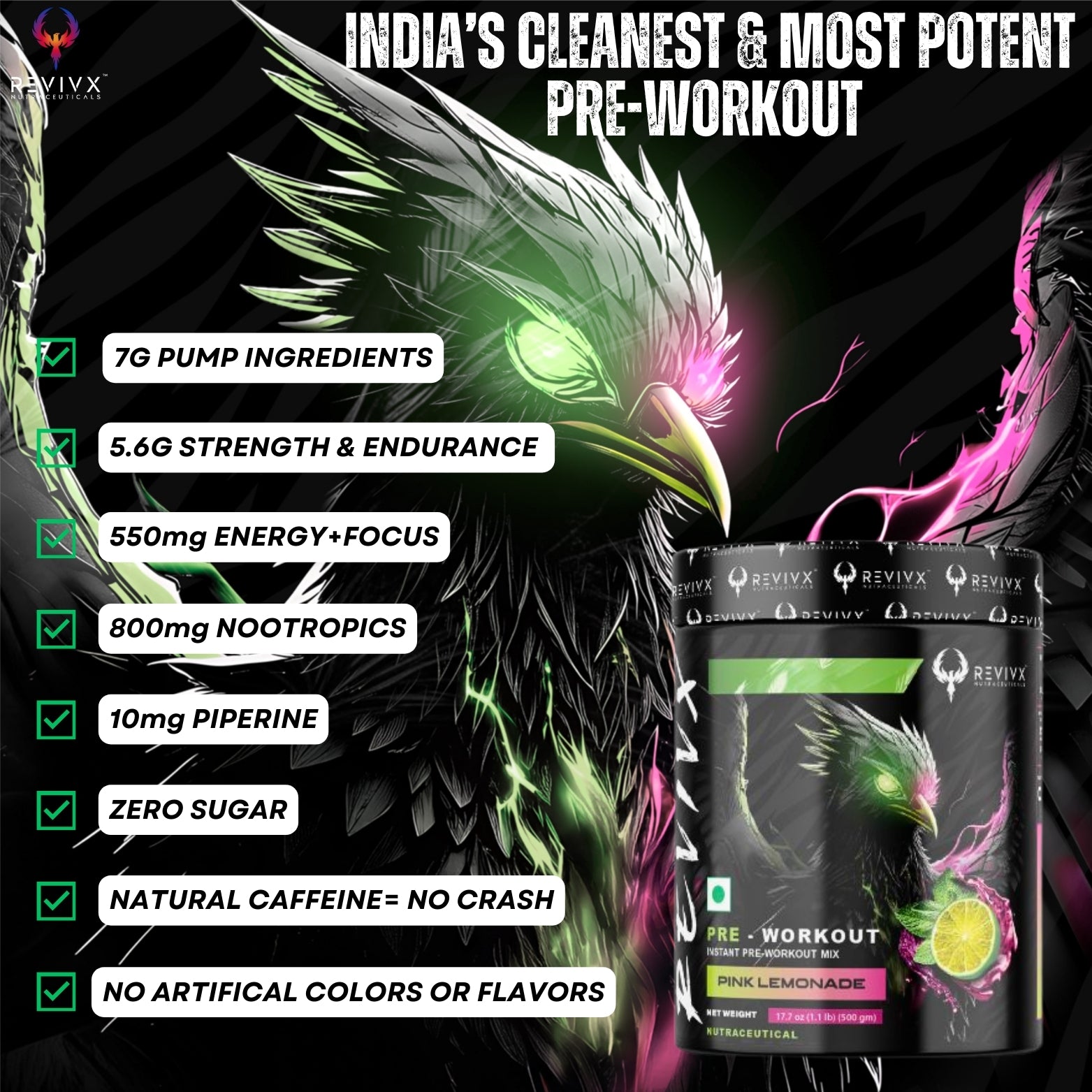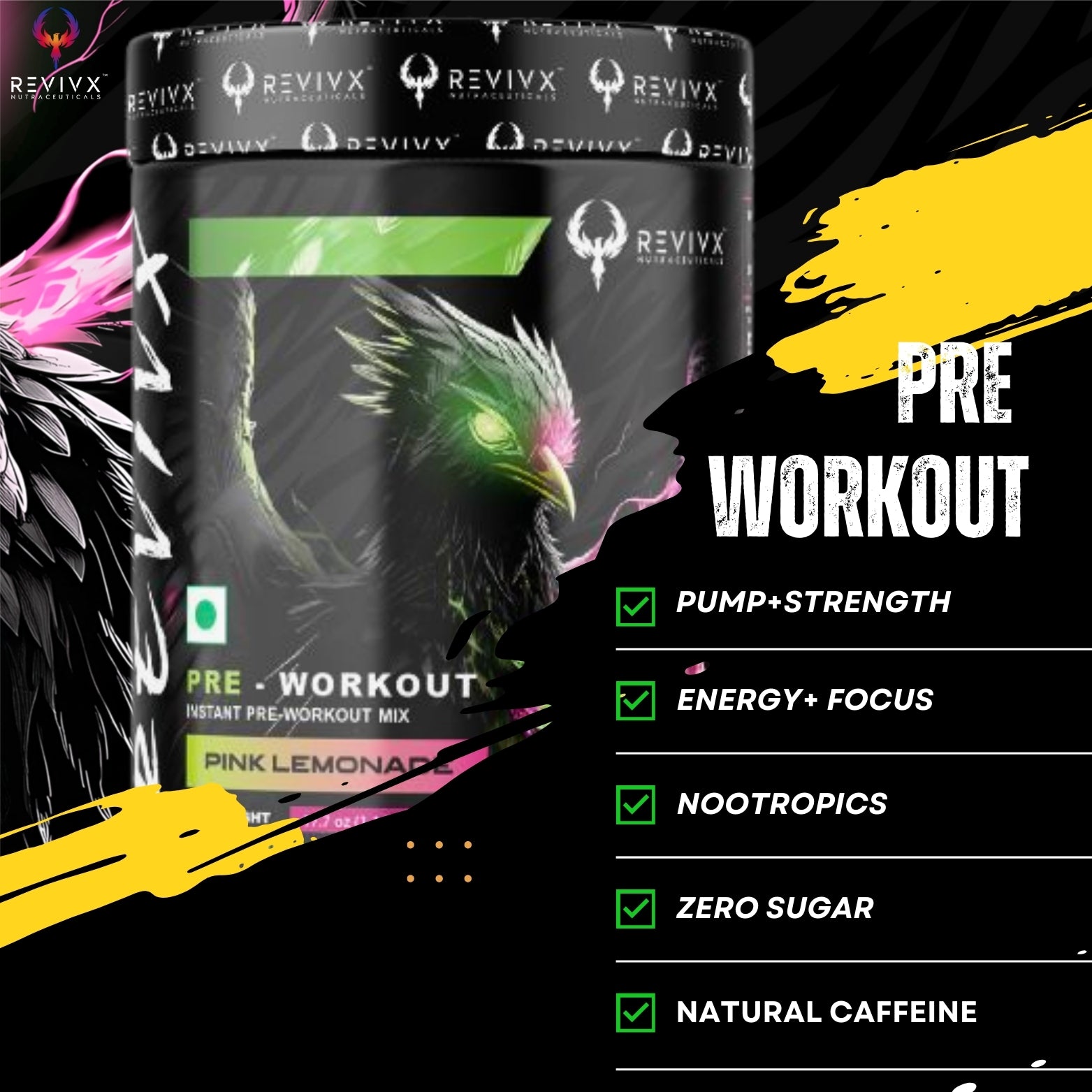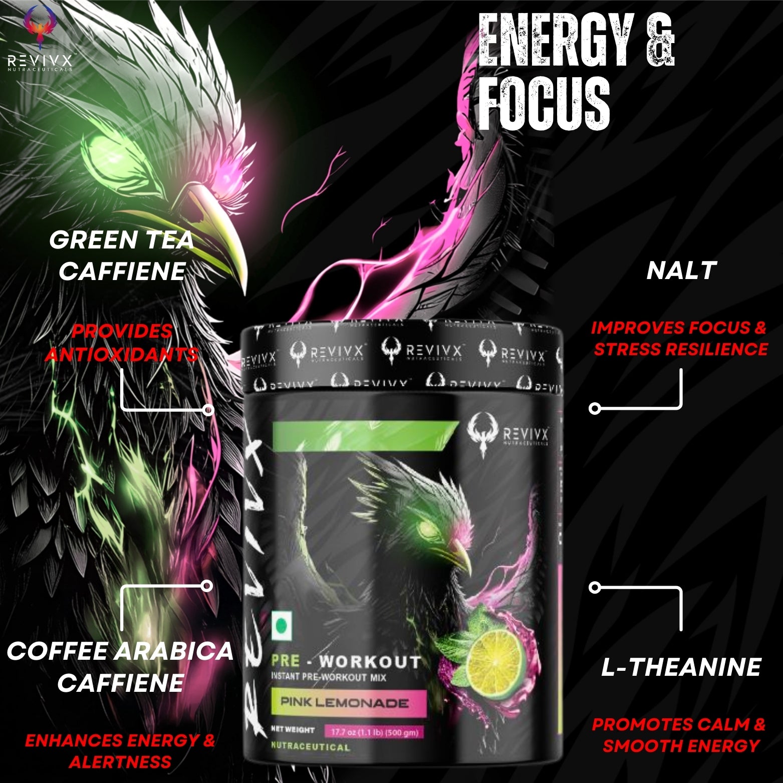 Whether you're chasing the ultimate pump, pushing for new strength records, or needing razor-sharp focus, RevivX Pre-workout has you covered. With natural caffeine for clean energy, nootropics for enhanced focus, and ingredients to maximize endurance and recovery, every scoop is designed to help you perform at your peak.