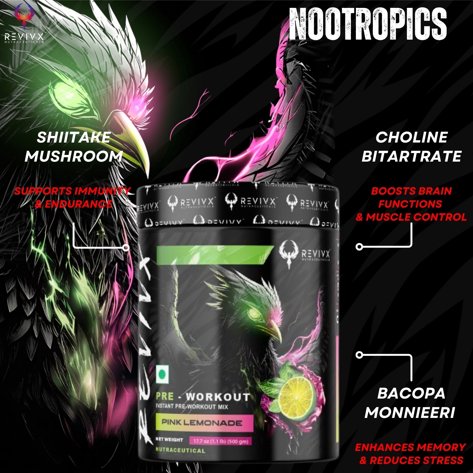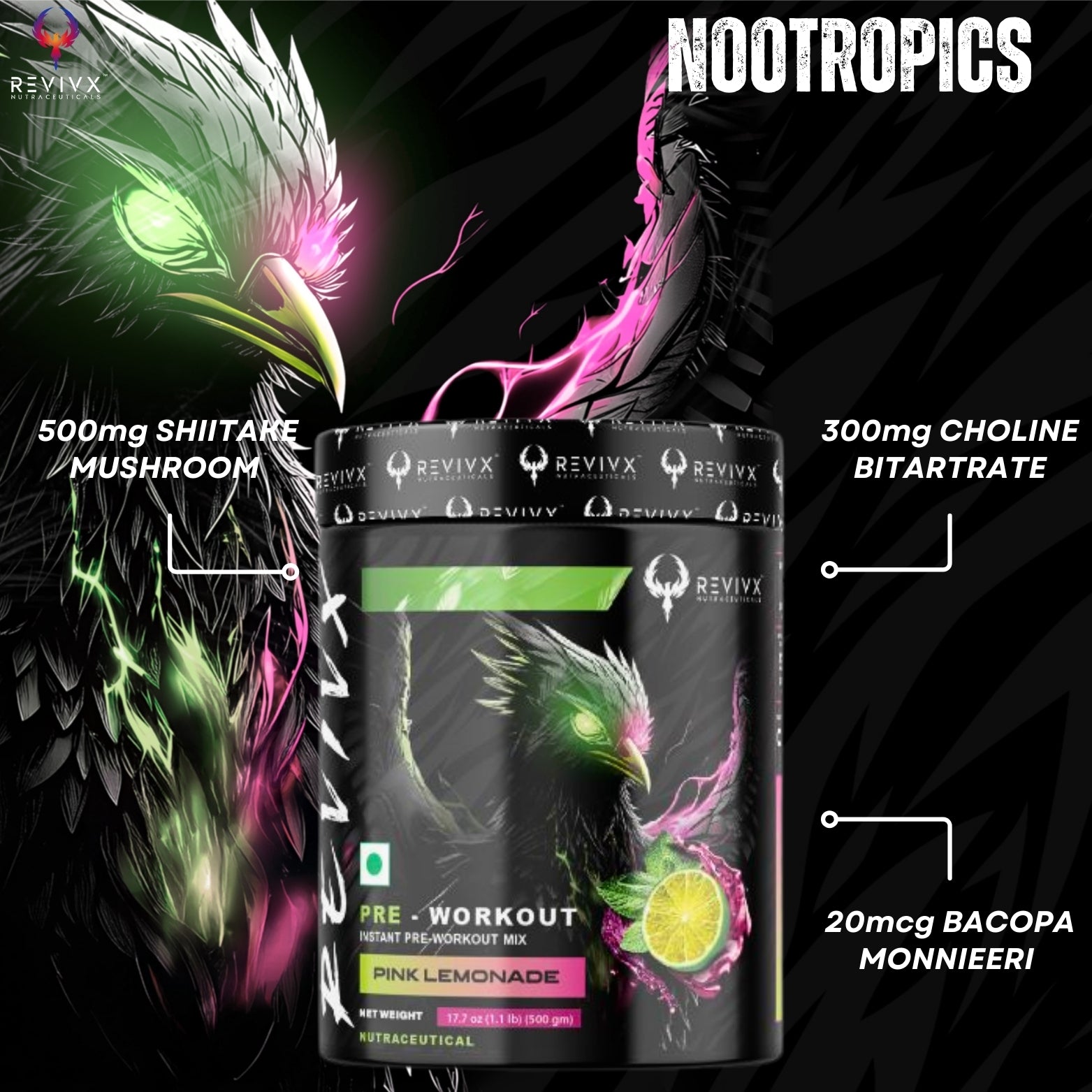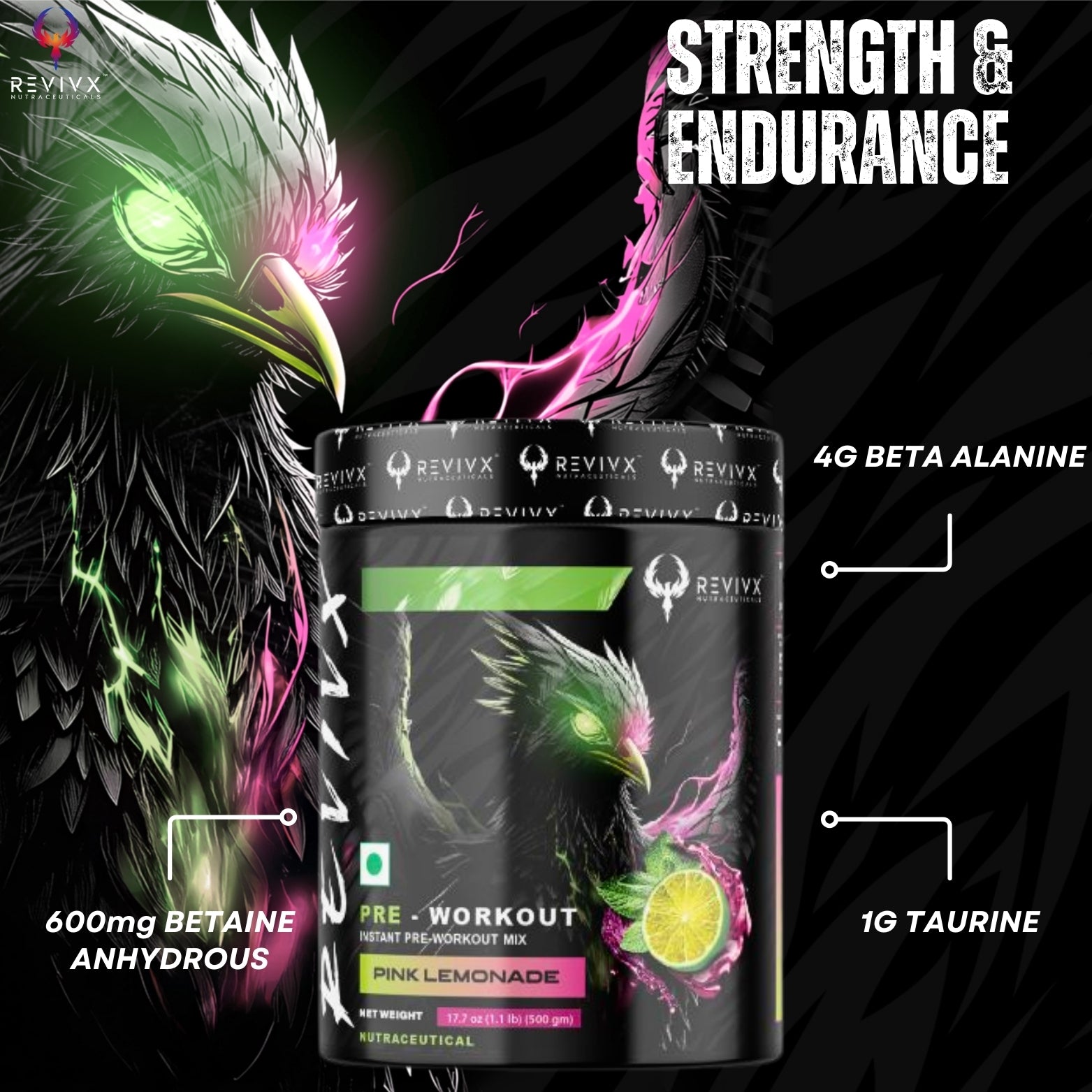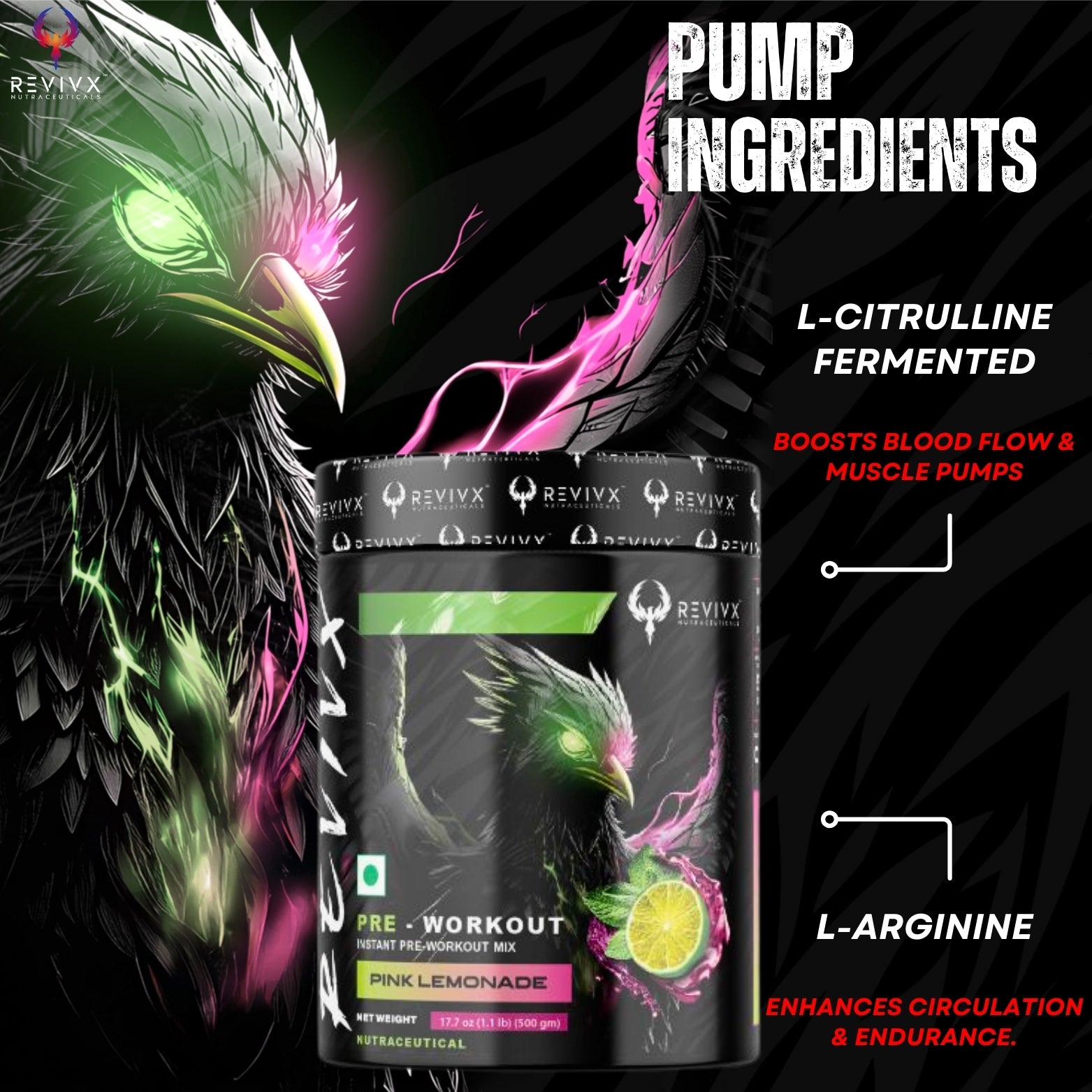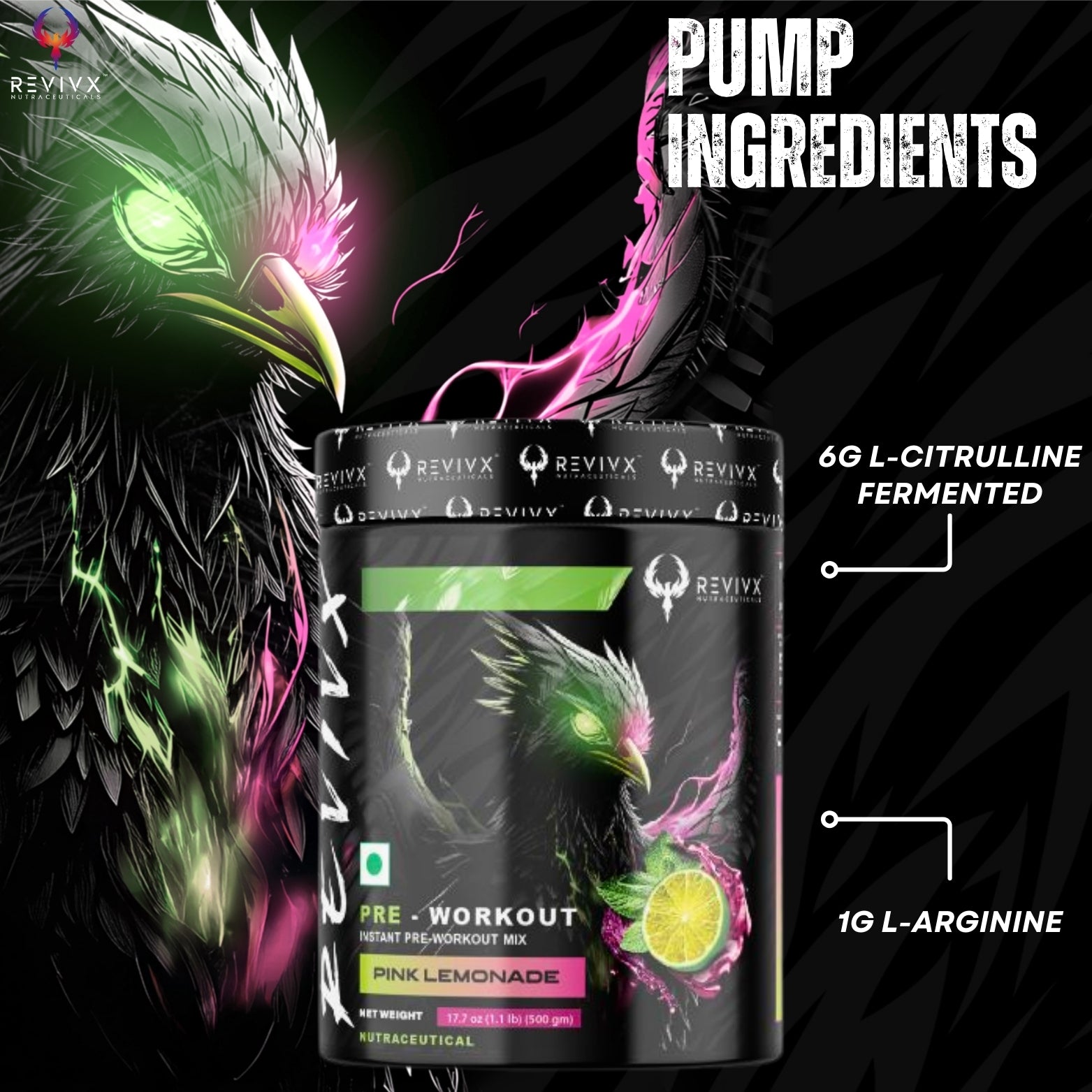 Whether you're chasing the ultimate pump, pushing for new strength records, or needing razor-sharp focus, RevivX Pre-workout has you covered. With natural caffeine for clean energy, nootropics for enhanced focus, and ingredients to maximize endurance and recovery, every scoop is designed to help you perform at your peak.