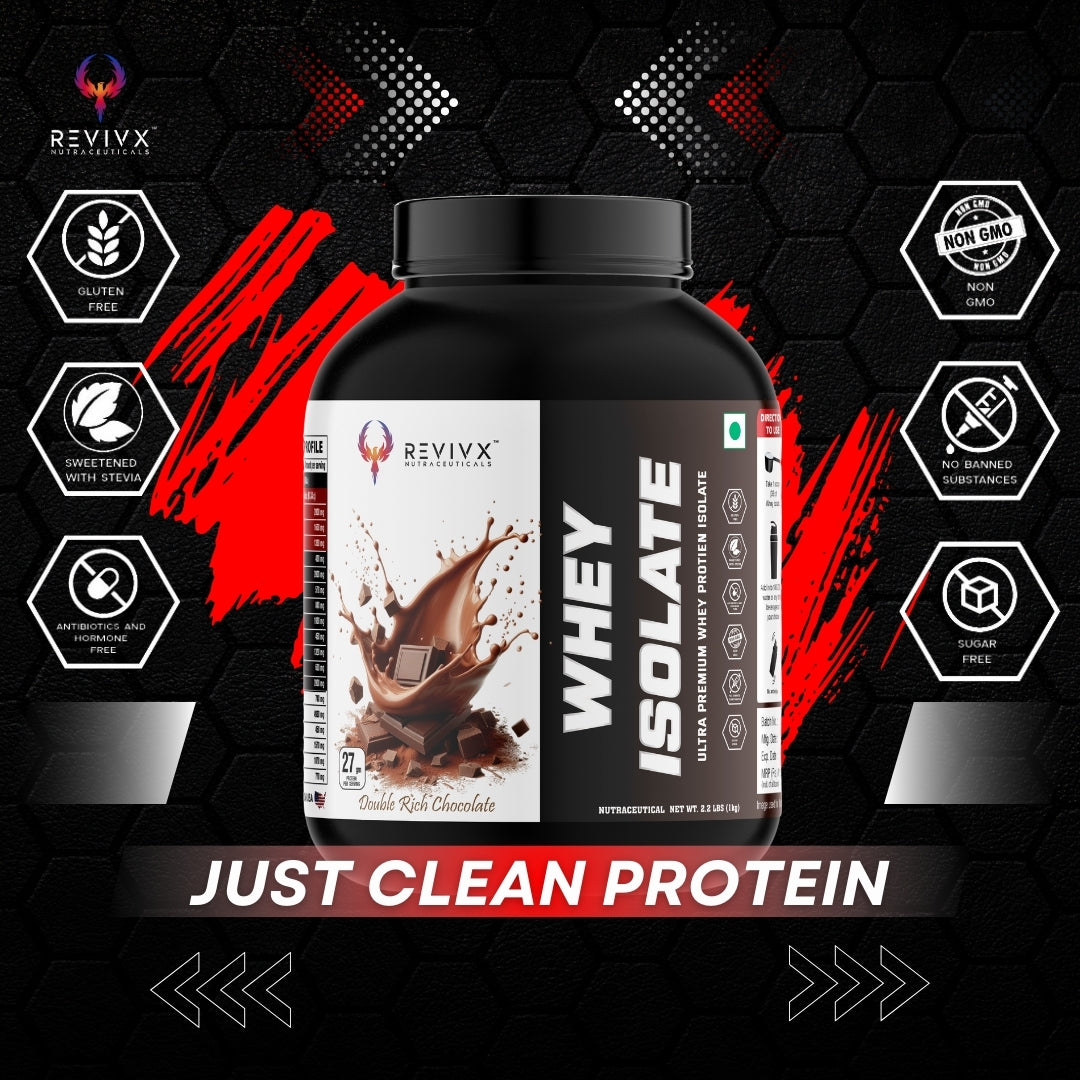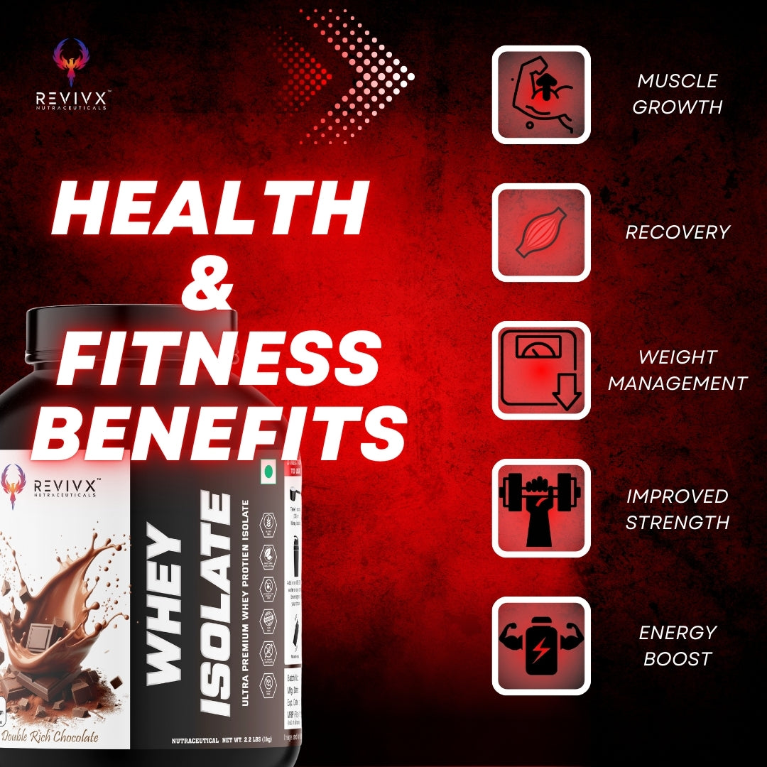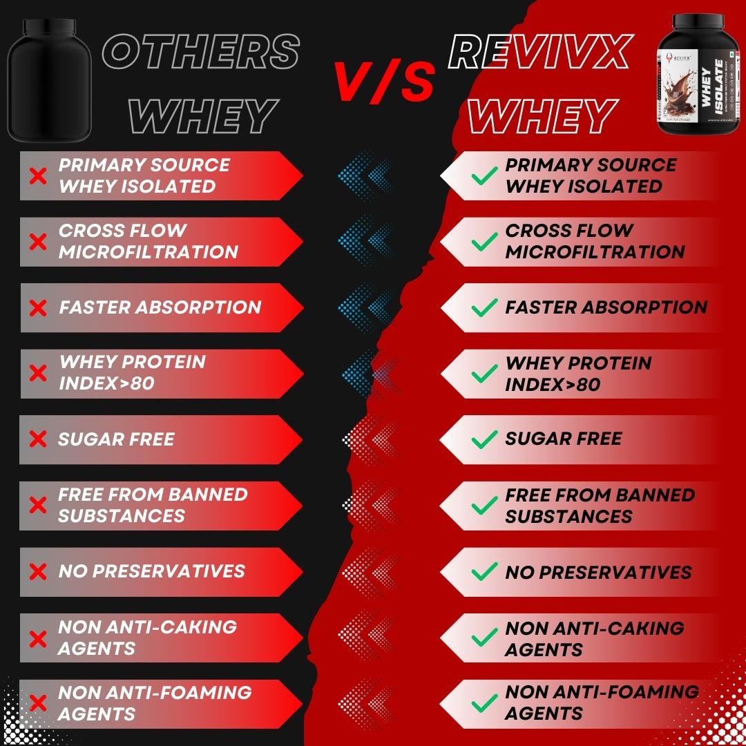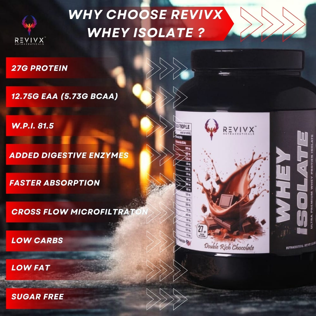 RevivX Whey Isolate delivers premium, fast-absorbing protein for muscle recovery and growth. Made from American whey isolate, it's low in carbs and fats, enhanced with digestive enzymes, and filtered for purity. Enjoy smooth, delicious flavor with every scoop. Fuel your body and transform your fitness journey with RevivX.